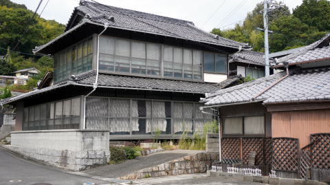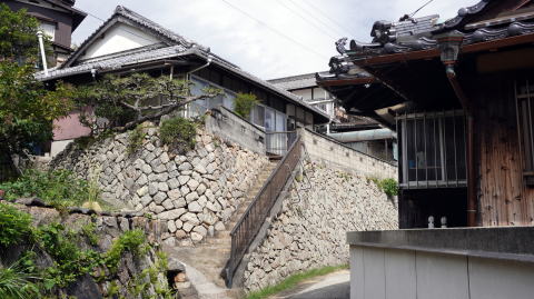 大柿町深江地区は能美島の南西部、海岸線が深く入組んだ湾奥に位置し、さらに湾口には大黒神島、沖野島とあり波穏やかな両港の典型のような地形にある。倉橋島を介して陸路でつながっており、呉市街地から45分ほどで到達できる。 そのような恵まれたところで、かつては石炭輸送船の中継基地として賑わったという。筑豊炭田で産出された石炭は若松から海上輸送され、中間点の当地で一時寄港することが多かった。往時は内燃機関と帆走を併用した機帆船という船舶が主体で、航行能力が低く途中で積み替えることも多かったという。 狭いながらも平坦地があり、面的に住宅地が広がっている。特徴的なのが商家を思わせる立上りの高い二階屋が多く見られることだ。二階部に木製欄干を持つものもあり、それらは荷の中継地であった頃の賑わいを残すものか。中心部には格式ある入母屋屋根を有する店舗建築が、古びた地酒の看板を携えている風景もあった。 また山裾の地区には石垣を駆使し宅地を造成した箇所も目立つ。付近の島々は良質の石材の産地であり、比較的簡単に入手できることも背景にあるようだ。また一方で、人がすれ違えるだけの狭い路地が展開する地区もある。このように、狭い範囲ながら様々な集落風景が見られるのも特徴と云える。 |