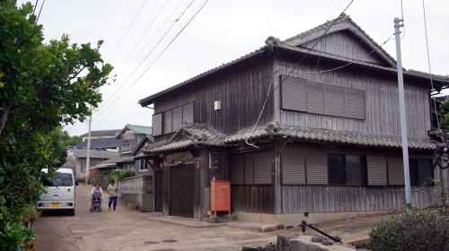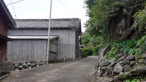 大島は小値賀島の南西3km余り、面積0.7m2程の小さな島で周囲には中小の島が散在しており比較的穏やかな海域である。小値賀町営船が1日4往復している。本土から直接訪ねることが出来ないいわゆる二次離島である。 島の北東に集落と港がある。遅くとも室町期には形成されていたといわれ、わずかな平地と緩やかな斜面にかけて家並が見られる。周囲は好漁場で、ウニやアワビ、サザエなどの採取漁業を中心に水揚げされ、また肉牛の肥育、落花生などの農業が盛んに行われている。 この島の歴史で著名なのが、江戸時代から続いた互助制度で、集落内で生活が困窮した世帯を島の東にある宇々島に移住させ、魚介類の採取や放牧の自由を与えて生活の建て直しを図るというもので、建て直し達成後大島に戻り次の対象者と交代するというものであった。昭和39年頃まで続けられたこの制度は民俗学的にも貴重で、宮本常一氏などの来訪もあった。 港の待合所付近には「自力更生」と刻まれた大きな石碑があり、そこから緩い坂道に沿い板壁の家々が散らばっている。石垣が多用され、アコウの気根が絡まっている姿などが見られる。 少し小高い所に小値賀小学校の分校がある。こういった学校は今ではほとんど閉校になっているが、この分校は存続しており真新しい講堂も見えた。若者のUターン率も高いそうだ。それは互助制度の歴史に根付いた住民の共助の精神があるからかもしれない。 |