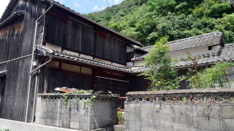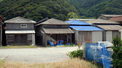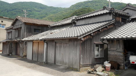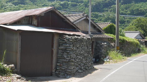 佐田岬半島の先端近く、佐賀関とのフェリーの発着する三崎港の入江南側の小半島沿いに大佐田及び井野浦の集落がある。両集落とも江戸期には宇和島藩領に属し三崎浦の枝浦であった。 大佐田の背後の山からは佐賀関と宇和海が一望され、中世には山城が置かれていた。寛文年間の記録では大佐田は家屋12軒で漁船2、井野浦は同8軒、漁船2と零細な村であったようだ。しかしそれぞれ、役加子3を含む加子8名の記載がある。井野浦には船番所も置かれていたという。 採取漁業が盛んで、両村とも現代の租税にあたる小物成はアワビであった。現在は多くが農家となっているという。 三崎港の入江に面し、穏やかな海浜風景が展開している。集落の展開は密集型漁村集落という形ではなく、比較的平地に展開しているためかゆとりの感じさせる建て方であった。 集落風景の特徴は海岸沿いの家々にある。伊予の青石と呼ばれる石材が豊富に採れる地域で、石垣を築いた家々が目立つ。特に井野浦では、海岸線に並んだ家々の外側を石積で防御した独特の風景を見ることが出来る。住居としては小規模で、漁具置き場か。一角には「青石公園」と名づけられた小公園もあった。なお、井野浦は明治時代に銅精錬所が置かれたという異色の歴史があり、地区内でも銅山開発が行われ戦後しばらくまで続いた。 大佐田では石垣に覆われた家屋こそ少ないが、港に面した一帯にはやはり小規模な家々の連なりがあり、井野浦と共通するものがあった。 |