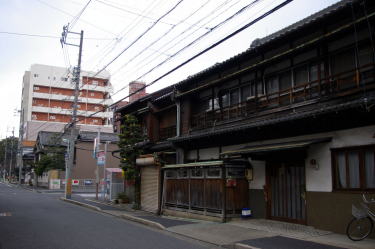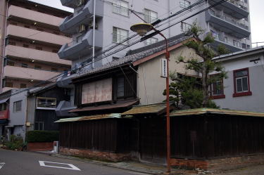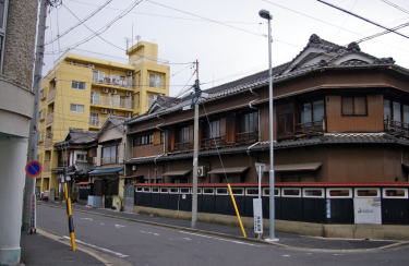 | 東海道本線と東海道新幹線、名古屋鉄道の三本が近接して並走している。ここで紹介するのは新幹線と東海道本線の間に挟まれた扇形の地区、尾頭橋3〜4丁目の界隈である。 伝統的な古い町並とは異なるが、戦後に八幡園と呼ばれる遊興地区が発達したところである。八幡の名はこの地区がかつて呼ばれていた八幡村に由来する。中心に尾頭橋公園があり、なぜか催し物でもできそうなステージまである。この公園を中心として放射状に枝道が分岐している。いわゆる当時の赤線地区として計画された名残と思われる。 線路に囲まれた狭い土地であることからか大規模な都市開発が行われなかったことが、その残影を濃く残す結果となっていようだ。長屋風の旅館建築が現れたかと思えば、次には細部の意匠にこだわりを持った店舗建築もある。いかにも妖艶で特別の客を迎え入れるような雰囲気に満ちているような外観だ。そうした建物が、今は閑静なマンション街・住宅地の中に高密度に残存している。 町並の性格からして保存の対象とはならないと思われるが、ここまで残っていること自体に高い価値が見出せるものといえよう。 |