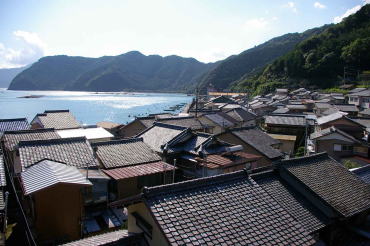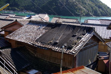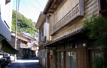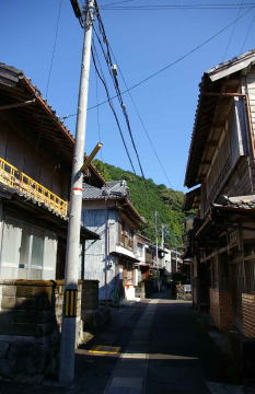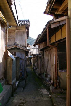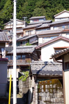 沈降海岸の続く付近の海岸線は平地に乏しく、ここも例外ではなく住宅地が展開する地形としては過酷だ。海岸線の一本道とその内側の生活道以外はほとんどが車の通行を拒む細い坂道や階段だ。或る所では階段を降りると漁家の裏庭であり、また他の場所では路地がいつの間にか縁側に接する敷地になっている。どこまでが道路か個人宅の敷地か判然としない。斜面に展開する家々は簡素な民家が多くを占めていたが、海岸に近い平地に建つ家屋は間口が広く、二階部に木製欄干を持つものもある。それらはもと船宿だったのかもしれない。 集落の高みから見下ろすと屋根が折り重なるように連なり、海岸付近から見上げると密度の高い家並が斜面に林立しているのがわかる。そして集落前の海は入江の奥のこと、鏡のような穏やかな海面を見せている。ここに各地の廻船が集うて来たことは自然なことだろう。 |