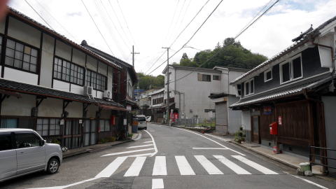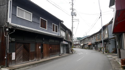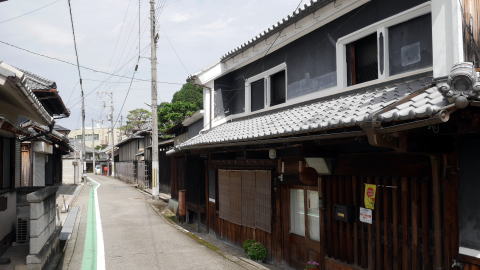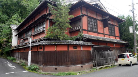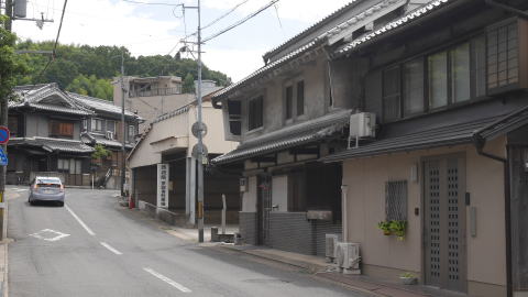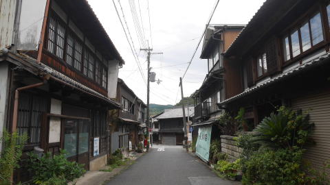 | 名が示すように町の興りは市場町で、中世後期には吉野地方の山林資源を商うところとして早くも商業が発達、我が国で最初の商業手形である「下市札」が発行された。18世紀後半の記録では月に六度も市立てがあり、大坂や堺・和歌山などからも商人が掛け付け、取引が行われていたのだという。背後にある吉野山地からは杉・檜の良材が得られ、箸などの加工品は名産品として知られ、農産物の他和紙や漆、薬草など多くの商品価値の高い特産物があった。和紙は京都にも上納されていたという。 現在は山間の小さな町という印象でしかないが、町は吉野川北岸の大淀町と対峙し、支流の秋野川に沿い細長く連なっている。町役場のある辺りまでは約3kmもあり、古くから大きな町場を形成していたことが感じられる。 川の東岸を国道が通り、この沿道が町の中心のように見えるが、対岸にも家並の連なりがあり旧市街地は比較的面的に形成されていたようだ。歴史を感じさせる建物はそれらのあちこちに散在して残るイメージだが、間口の広い平入りの商家風の建物、造り酒屋など質的に高い建物も多く、際立って見応えのある町並風景は少ないものの商都として発達した規模の大きさを感じる。 800年前に創業し、全国最古の鮨屋と云われる「弥助」も古い構えのまま現役であり、弁柄を塗られた壁が印象的であった。 |