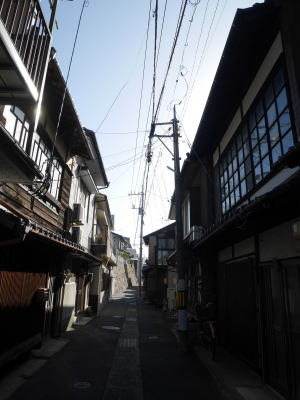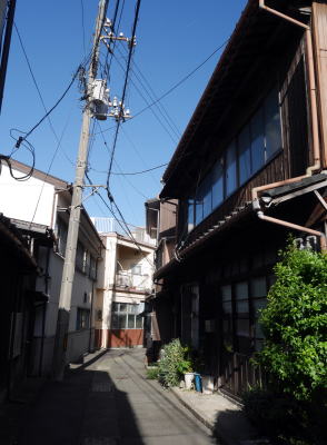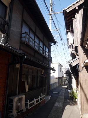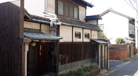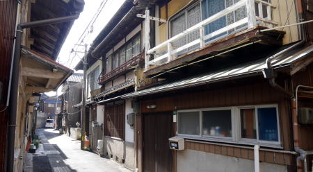 下関伊崎町は下関駅から北西に位置する界隈で、北東は遊興の地としても賑わった新地地区に接し、南側は細い海峡を挟み彦島に相対している。 江戸時代は長府藩の支藩・清末藩領に属し、伊崎浦と呼ばれる漁村だった。延享4(1767)年の記録で家数233のうち表向浜側家数81、同山側家数78とあり、当時から海沿いに細長く集落が展開していたさまが伺える。その後埋立てが行われ伊崎開作と呼ばれ、各地との物資交易拠点とした。清末藩はここで問屋荷受を行おうとしたが長府藩の反対を受けて問屋業を始めることはできなかったようで、純粋な漁村として経過した。漁業は鰯やサワラ、鯛などの近海を中心としたものであったが漁獲に恵まれ、町場も賑わっていたようだ。 伊崎町の路地は軽自動車なら何とか通れるほどの狭いもので、その両側に家々が密集して連なり、江戸中期の記録通りの姿を残している。むろん建物は現代風のものではあるが、格子や二階部正面に木製欄干を残すものなどが見られ、また地区の東部では新地地区に接していることもあって銅板葺の庇や窓の意匠など、遊興地に特徴的な外観を持つものもあった。 |