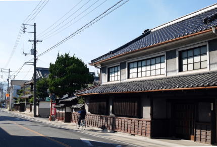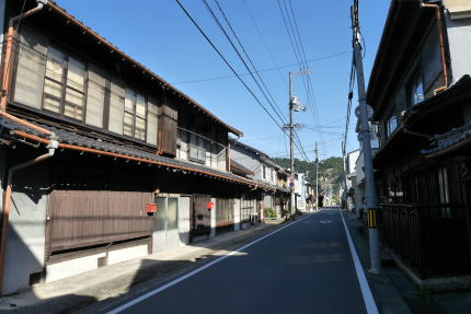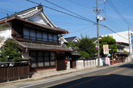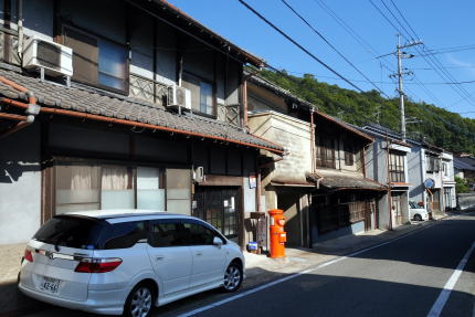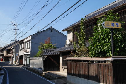 大坂その他に出荷されるようになったのは明治に入ってからで、中期には問屋が町中に軒を並べるようになったという。新市駅の北東側を中心にそれらの名残が見られるが、福山などの都市近郊の機能も強く、連続した古い家並はほとんど残ってはいない。それでも屋敷型の中庭を従えた旧家、切り妻平入形式の民家が散在している。二階部下半になまこ壁様の装飾があり、この地方に良く見られる形式である。但し繁栄時期となった明治後半以降の物がほとんどのようで、桟瓦葺きのみであり、厨子二階、卯建や袖壁、虫籠窓等は見られなかった。 駅前の大通りの一本北側、町役場に近いあたりに「大正通り」と名付けられた筋がある。大正時代絣の中心であったところなのだろうか。この通りにも数軒、伝統的な造りの商家を目にすることが出来た。 |