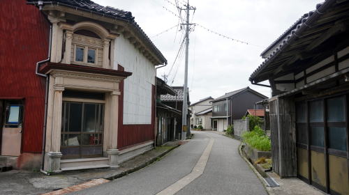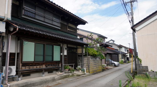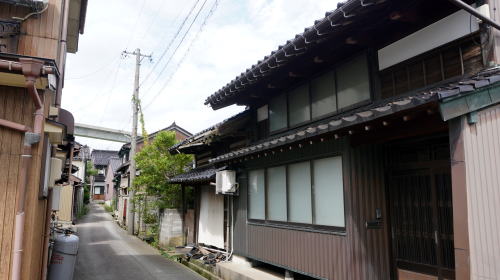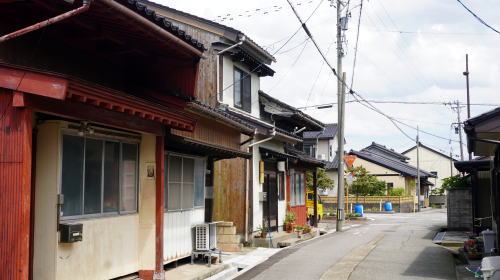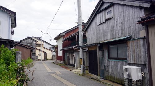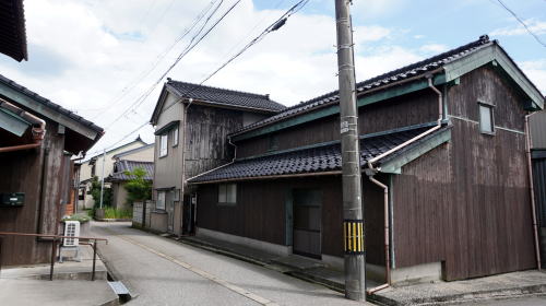 堀岡地区の東に接する海老江地区も同様に街村的風景が展開する。浜往来の中継点に位置し、宿継場としての色彩もあったといわれ、漁業などの支障になることから近隣の下村から宿業務に携わる者が徴用された。天保4年の記録では210戸を有し、地引網等を中心とした漁業の他、魚の売買を行う商人や売薬商人も存在していた。 町並的には堀岡地区ほど古い建物は見られず、連続性も低かったが隅切り部に洋風の構えを持つ建物など、印象的な風景も見られた。こちらは松林を通してすぐ富山湾が望まれ、今でも海に接する集落であった。 |