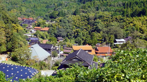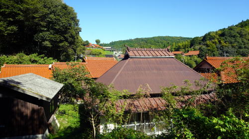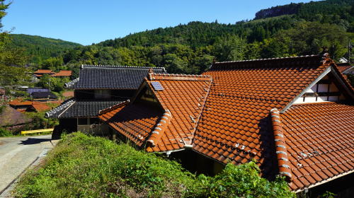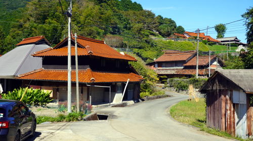 わが国最大のカルスト台地として知られる秋吉台は、一様な高原状ではなく緩やかながら丘や谷がある。一部は山焼等により人の手が入り、草原地帯が波打つ風景はそのものが観光資源ともなっている。 江原地区は台地の南西側の外れにあり、一般の観光客などは訪れないところである。幹線道から細道を10分余り辿ると、案外開けた眺望の一帯に赤褐色の瓦が散在しているのが目につく。特徴的なのが、家々が散らばっているのが周囲より一段と落ち窪んだ地形になっていることである。 これは「ウバーレ」と呼ばれる台地特有の地形で、小規模なものは台地のあちこちで見られるものだが、この集落のように人家や生活があるのは珍しく、最近はネット等でも紹介され、訪れる人も徐々に増えていると聞く。 家々は擂鉢状の窪地の底部、斜面部、丘の上と散在し、ひとところにまとまった形ではない。石灰岩質の土壌は水がすぐに地下に吸収されることもあり生活水や農業用水が得にくく、井戸に頼るしかなかったことにもよるのだろう。 江戸期には既に集落が形成されており、稲作は不可能であったため麦や煙草などが栽培されていた。税として納める必要のあった米を栽培しなかったことで、比較的裕福な農家も多かったといい、新たに入植するものもあったという。 南側の斜面から急坂を辿って集落に入ると、二階の立ち上がりが高く付属屋を従えた大柄な農家が数棟目につく。もと茅葺らしいトタンを寄棟の形に屋根を覆った家屋もある。入母屋の立派な屋根を持つものも少なくない。 谷底に降りて見ると個性が感じる集落風景ではない。ただ谷底にも関わらず河川がないのも特徴で、雨はすぐに地中に浸透し、数箇所ほど側溝から地中へ誘導する吸水口があるという。それらは麓で伏流水として再度地上に現れ、田畑を潤している。 道の傍らには集落の案内板も設けられており、外来者にも集落の特徴などが判りやすく説明されている。静かに散策するのはよいが、観光地化などされず地元の方々の生活が息づくところであるべきだろう。 |