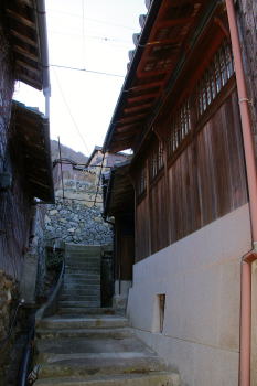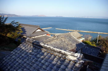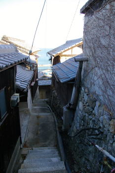 | 集落は南から浜・浦・板持の3箇所で、多度津からの船が発着する港に近い浜・浦集落にほとんどが集中する。 平地にある浜は海岸線を岸壁が巡り、少数の漁船が停泊するのどかな集落だ。家並の裏手は畑もあり、自給自足の生活が今でも可能かに見えた。 港を挟んで北側にある浦集落は、海岸線を歩いていくだけでは一見その存在がわからない。この集落は海崖上の台地に開けているからだ。そして崖の上にはこの島を特徴付ける町並景観が広がっていた。 海岸沿いの道から桟道のような階段が崖の上に伸びている。その人がすれ違うのがやっとの細道を登ると、石積により雛壇状になった路地に沿い、民家が点在し町場が形成されていた。特筆されるは本瓦を葺いた家が多く見られることで、純粋な漁村でしかないこの島の集落にあっては意外性を感じさせる。 路地には下段の家屋の屋根が迫り、山側には石積が立上る。ほとんどが空積の簡素なものだ。家々は海側にわずかな庭を持ち、金柑などの柑橘類、そしてわずかな野菜を育てている。今は水道がひかれているのか定かでなかったが、島の斜面では水が得にくいのだろう、各戸に井戸が見られた。 路地は等高線に忠実で、坂道を極力作らないように設計されている。反対に海岸から山に向って付けられた通路は当然のことながら階段だ。海岸に通じる道は極めて少なく、横路地を中心に発達している。 しかし、住民の姿はほとんど見かけることが無い。半数以上は無住になっているからだ。中には本瓦が半ば崩れ、庭も内部も荒れ放題になっているものもある。海風もきつく侘しい雰囲気の漂う集落であった。 かつては廻船業にも従事し、明治から昭和初期にかけては高見島村という独立した自治体で、人口も千人近くを数えていた。室町時代にも記録のある古い集落で、半農半漁の生活だったが、江戸期に幕府領であったこともあり御用船方もつとめている。また周辺は豊かな漁場であったため、特に鯛網などで周辺の島々の中でも最高の漁獲高を誇っていた。他にも旅廻船の水主となり全国各地を巡った。明治以降遠洋漁業も盛んになり、朝鮮沖まで出漁したりと、島民は海とともに生活し、海によって生計を立ててきた。 海岸沿いでは人よりも猫の姿の方がよく眼に入った。海を挟んで見える多度津・丸亀の町を目の前に、近年の過疎化は著しい。しかしその中にあってこの浦集落の形態は島の集落としては特殊な部類に入るだろう。このまま風化してしまうには余りに惜しい。 |