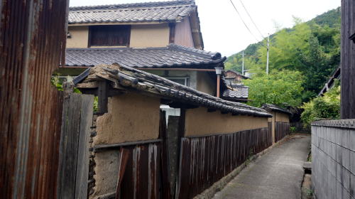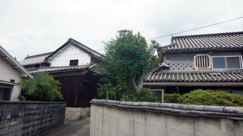 玉島黒崎地区は旧玉島市の区域では最も南西側に位置する。 その中でも最も端部、西は寄島町に接するあたりは南浦と呼ばれ、南は瀬戸内海に面する穏やかそうな佇まいを見せている。 訪ねてまず一番に目に付くのが立派な造り酒屋である。残念ながら現在は営業を終えられているが、この旧赤沢酒造は江戸後期の万延元(1860)年に創業、長らく地場産業の発展に尽力されたが2004年に高潮被害に遭い閉業に至ったとのこと。 江戸時代には南浦は黒崎村の一部で、元禄8(1695)年の記録では家屋数66と寒村であったが、享保15(1730)年に杜氏が来村したことがきっかけで酒造業が発達、最盛期には酒造に携わる者が35軒もあったとの記録がある。 海に面するが漁業は余り発達せず農村として経過しており、現在の集落風景もそれに呼応した姿になっている。家々は海岸付近から比較的離れたところに散在的に見られ、周囲に耕地が広がっている。ただ、本瓦を葺いた入母屋屋根を持つ家、土蔵を従えた御宅など、建物単体としても立派なものが少なくなく、他の建物や路地と重なった所では、趣のある小風景を形成していた。 幹線道路からは外れた場所にあるため車両の往来も少なく、ひっそりとした集落の印象が強調されているようだった。 |