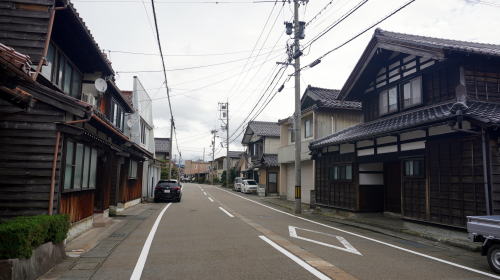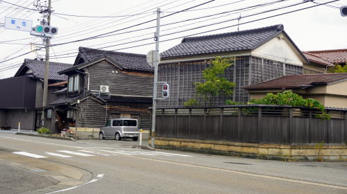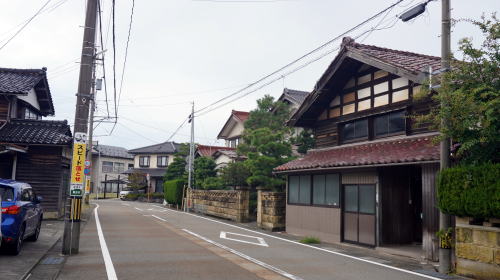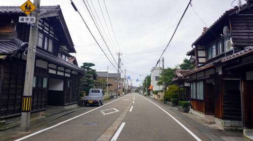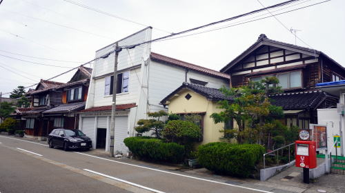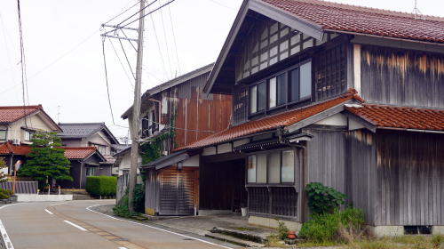 加賀地域のほぼ中央部、手取川下流部左岸に位置する粟生地区。白山連峰を水源とし日本海にそそぐこの川は下流域で広大な扇状地を形成し、この粟生付近が扇端に相当する。 地区内には北陸街道が通過し、江戸前期の寛文6(1666)年には既に宿駅として駅馬30匹、馬方36名が配備されていた。また渡船3隻と渡し守36名が記録されている。これは手取川を挟んだ次の宿場・水島宿との間の川渡りのためであり、手取川の渡しは街道上の難所であった。そのため増水時には宿を取らざるを得なくなるなどして、賑わった宿場だったようだ。 旧街道は明確に残っており、周囲に新しい住宅地が面的に拡大しているものの街村の形が保たれている。妻入り中心の古い町並が500mほど連なっていた。赤瓦を背負い、街道に面した妻部の真壁など、この地方らしい佇まいが見られた。伝統的な建物の連続性が感じられる箇所もあり、予想以上の町並が展開していた。 一角には「創業明治拾八年」とある糀店の看板を掲げる旧家もあり、少なくとも鉄道が開通するまでは宿場町以来の町の賑わいが続いていたのだろうと感じさせた。 |