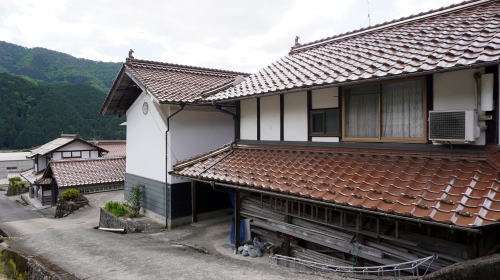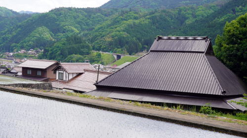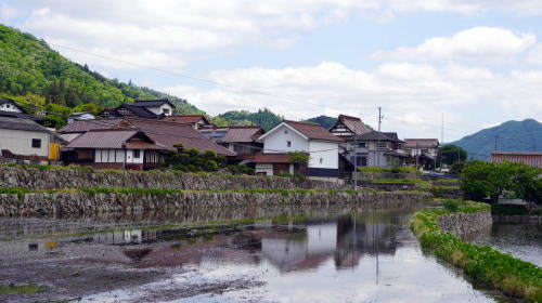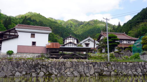 中国自動車道の戸河内ICの東側付近、自動車道上から北側に眼を向けると山裾に集落の広がりが見える。この上殿地区は明治前期までは上殿河内村という独立した自治体で、長田・本郷と呼ばれた中心地区を形成する。『芸藩通誌』によると農業とともに御用材木、御用板の産出があり、炭や下駄などの製造に携わる者もあった。また紙漉きが盛んに行われ、71人が従事していたという記録がある。 遠方から見ると家並が密集しているようにも感じられるが、集落内に入ると水田の間に家々や土蔵が散らばる農村集落だ。訪ねた時は田植えを控え、張られた水に建物や石垣などが映り季節の風情を感じさせる風景が展開していた。農家とはいえ豪壮な構えの建物も目立ち、また寺も見られるなど一つのまとまった集落としての姿が感じられた。 緩やかな斜面に展開しており、石垣により標高差が克服され水田や宅地の区割りとなっている。奥に位置する水田や家々から斜面を利用しての水の供給網が築かれており、一部は生活用水にも共通して利用されているようであった。道端に共同の洗い場があったり、庭先に鯉を飼う風景などもあり、集落風景に潤いを添えていた。 |