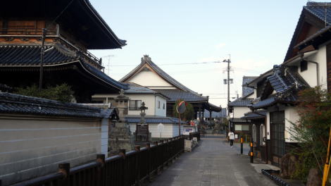 宇佐市四日市地区は江戸期に陣屋がおかれ、近傍に市役所もあり市の中心をなしている。その昔は四日市城があり、廃城後は中津城主の小笠原氏が支配していたが、元禄13(1700)年に幕府により召上げられ、4万石を支配する代官所が設置された。慶応3年に筑後久留米藩預り地となるまで、四日市陣屋による幕府の支配を受けていた。 またもう一つの特徴として、地区内に二つの本願寺の別院があることだ。宗教的なことに不案内な私の文では伝わりにくいので、東本願寺四日市別院のホームページから引用する。 真宗大谷派四日市別院は、大分県宇佐市四日市にある真宗大谷派の寺院である。同派の別院。真宗本廟(東本願寺)を本山と仰ぐ。日豊教区に所属する。 浄土真宗本願寺派の本願寺四日市別院(西別院)と隣接し、東別院とも呼ばれる。このように両派の大寺院が隣接する景観は他に例を見られないとされる。江戸時代には九州御坊と呼ばれ、九州の同派寺院を総鑑する大寺院として栄えた。 この二つの寺院を中心に家並が展開しており、両別院の門前町といった風情である。仏具屋街や土産物屋街といった典型的な門前街は形成されていないが、塀を巡らせた邸宅や商家の建物が並び風情のある一角もある。小規模ながら飲み屋街のような一角もあった。 訪れる人もほとんどなく静かなたたずまいだった。訪ねたのが夕方に差し掛かっていたためもあるだろうが、大変特色のあるところなのに、この両寺院も町並としても余り知られていないように感じた。 わざわざ目的として訪ねるまではないにせよ、立寄るには十分に価値のあるところと言えよう。商家の並びの向うに寺の大屋根を望む風景はなかなか見応えするものであった。 |