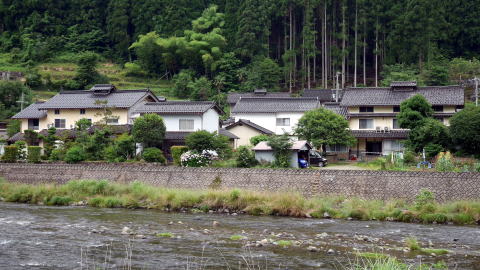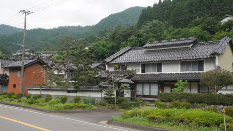 | 左近山・伊豆地区は円山川支流・大屋川を挟んで向い合う二集落である。 左近山は山が左に迫った地形の意ともいわれ、古くは迫山も記した。その通り川岸には平地がなく、斜面上に展開する集落となっている。しかしそんな中でも三階建養蚕集落が見られ、土蔵も多く見られる。宅地を確保するため石垣が多用され、かなり高い石積も見られる。離れたところから見ると、川沿いから石垣を多用しながら三段・四段に家々が建ちあがっている様子がわかる。 一方、右岸側の伊豆地区は狭いながらも平地が展開し、家々の展開も左近山地区とは対照的である。気抜きの小屋根を持つ三階建の養蚕家屋も多く、その卵色の漆喰の建物が対岸から見ると何だかリズミカルに並んでいるように感じられる。近づいてよく見ると、もとは養蚕目的だった建物を改装して一般家屋として三階屋を上手く利用されている姿も見受けられた。 両集落とも藩政時代の多くは出石藩領であったが、伊豆村は江戸後期の天保7年からは幕府領となった。しかし当村には大屋川沿いの32村の大庄屋小野山家が、幕府領になるまで置かれていた。大屋川もこの地区を過ぎると平地が広がり、町場の広谷村を控えていたことから、川沿いの諸村にとって要であり関所のようなところであったのかもしれない。 |