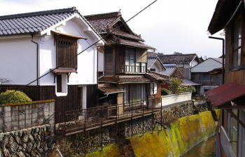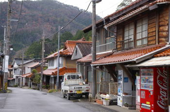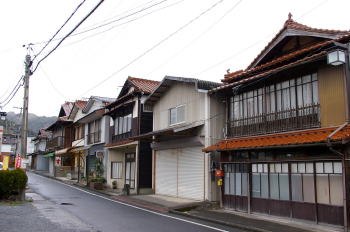 本郷村は岩国市に流れる錦川の支流・本郷川沿流に開け、かなり山深いところである。各方面からの道路が通じているが幹線道路ではなく、通過点にもなりにくいところで、町中もひっそりとしていた。 藩政期から紙漉きをその業としていたことは先に訪ねた宇佐郷と同様であった。藩は原料となる楮の生産者とその量を帳面に登録させ、それを紙に漉いて所定の量を納入させた。それらは周防山代紙として大坂などで販売されたが、享保3年には当地の紙漉百姓900人が窮状を訴えるため萩へ向うなど彼ら農民の生活は潤うことなく、苦しいものだった。 まとまった集落は本郷のただ一ヶ所で、しかしながらここには一つの町場としての家並の広がりがある。それらは赤褐色の屋根瓦を持つものが多い。先に訪ねた宇佐郷はここから北に山越道を経てつながっており、同様に赤瓦が見られることから考えると、この街路を介して古くから山陰方面との交流が深かったものと思われる。幾つかの街路が交わり、町場が形成されているという点も宇佐郷と共通するが、大きな商家や店舗の建物は少なく、小規模な妻入りの家屋や一部平入りの町家などが、街村のような形で一列に連なっていた。しかしその街路は本郷川に沿って地形なりに曲線を描き、また坂道となっているため連続性のある家並風景となっており、豪壮な町家建築があるわけではないが次にどんな家並が見えてくるのか期待しながらの町歩きができる。 これといった産業はない町のようで、町中を歩いても地元の人を見かけることは少なかった。 |