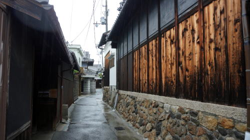 八尾市恩智地区は市域南東部、生駒山地を形成する高安山の南西麓を含む一帯を指す。近鉄大阪線の駅があり交通至便な場所であるが、道路は入組んだ細い街路が多い印象である。 古くは河内国高安郡に属し、東高野街道が地区を縦断しており中世には恩智城が構えられていた。城地の東側には天平10(738)年の史料にもその名を見る恩智神社が鎮座し、歴史の非常に古いところである。 江戸期にはこの一帯では綿作、木綿織が盛んに行われた。高安山麓では「山の根木綿」と呼ばれ名産品となった。問屋も多く立地し、「山の根組」いう仲買組織が生れた。組合の規定を作るなどし新規商人の台頭や流通の拡大に対応し、恩智村は木綿の集荷の中心的役割を果たしていた。 古くからの街区は近鉄の線路より東側の部分で、恩智川を渡ると路地が支配する町並が展開する。東高野街道はそのまま国道170号となっており、国道としては貧弱な感じだが十分車のすれ違いが出来る幅員があるので旧街道としては立派なものである。 恩智神社の鳥居付近から東に進むと山裾の一帯となり、細い路地がますます増え迷路状となる。この付近が真骨頂といえ、長屋門を持つ屋敷や板塀土塀を巡らした路地、小路には不似合いなほど立派な商家風建物などを見ることが出来る。 また、鳥居から旧街道を挟んだところには立派な屋根の古い建物がある。大和木綿問屋を代々営んだ萩原家の住宅で、現在はギャラリー等として使われている。裏手にも複数の土蔵を連ね、裕福な木綿問屋であった事がわかる建物群である。 |