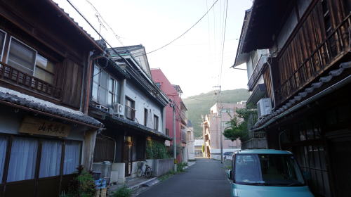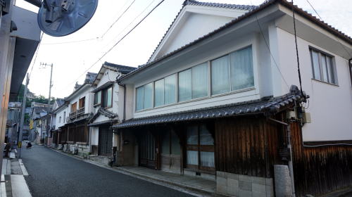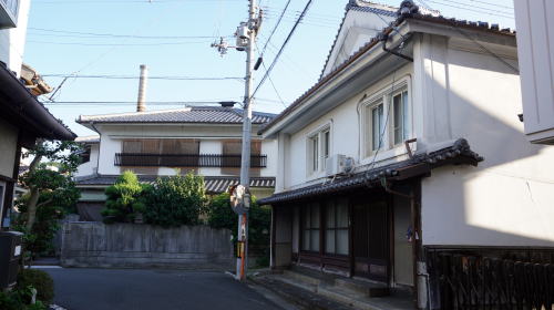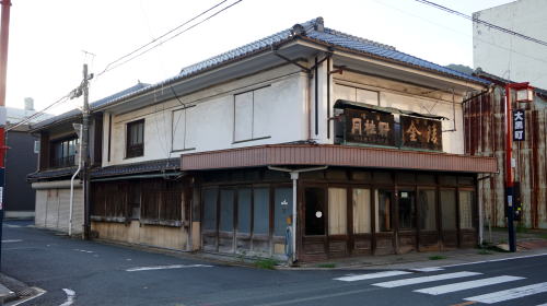 | その平坦な地区を中心にかつての商家を思わせる建物があちこちに残る。特に浜之町から新町にかけての小路には連続性の高い古い町並も残っている。平入り妻入り混在であるのも特徴で、また軒下に大きな木製の持送りを持つ町家、もと医院の洋風建築などさまざまな姿で往時の残影が感じられる。主要なポイントには市による簡単な案内板も立てられており、町歩きを興味深いものにしてくれる。面的な展開を見せる河口近くの埋立地とは別に、千丈川から幹線道路を挟んだ反対側の矢野町界隈にはやや街村的に連なる家並があった。これがかつての街道筋なのかもしれない。 今回再訪してみて、一部失われた建物もあるものの多くは健在であり、かつて商家が建ちならび伊予の大坂と呼ばれるほどの賑わいがあった往時の趣が変らず感じられた。また、前回は歩いていなかった港に近い大黒町界隈に思わぬ町並が見られた。この付近は東側の地区と街路の方向が明らかに異なっており、後発的に市街地化されたところか。旅館や漆喰を纏った旧家、一部では二階に木製欄干を残す家もあり、濃厚な町並が展開しており新たな収穫であった。 千丈川の左岸地区にも密度は低いながら商家や町家の建物、路地風景などが見られ、改めて市街地の広範囲に古い姿が残っている印象を強くした。 |