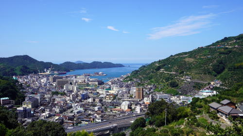| 湾奥のわずかな平地に展開する八幡浜の市街 | |
