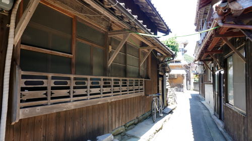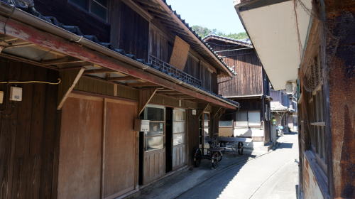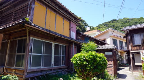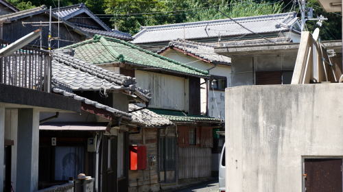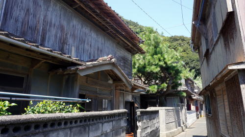 大島は八幡浜港から南西10km余りの宇和海に位置している。大島と呼ばれる島は大変多く、県内だけでも四箇所あるため、八幡浜大島などと呼ばれ区分されている。 南北に列島状をなす5つの島から構成され、そのうち大島と地大島が大きいが人家があるのは大島のみで、東岸にある小さな港に一日三往復の客船が発着する。三王島を挟んで大島と地大島は陸続きとなっている。 江戸時代は宇和島藩領に属し、穴井浦と呼ばれ近海漁業中心の漁村として発達してきた。明治前期に大島村として独立、昭和30年に八幡浜市の一部となった。 港付近を中心として集落は海岸線に沿い南北に長く連なり、南側は三王島の近くまで1kmほどにわたり続く。港の北側付近にごく限られた範囲だが平地もあり、一部は背部の丘に向けても路地と建物が見られるが、その他ほとんどの区間ではひたすら海岸線の路地両側に展開する家並である。北端に学校の建物があるが廃校となり現在はグラウンドの部分に水産物の養殖施設が置かれている。 港付近から北側にやや大柄な建物が目立ち、一軒のみだが商店も見られる。ただし、外来者のほとんどないこのような島では看板がない店も多く、実際私が店と思った以外にも店舗があるのかもしれない。木質感の高い建物が細い路地に向き合う姿は島の町並らしい風情を感じることが出来、二階正面、一部には一階部に端正な木製欄干を残す家も見られた。 訪ねた時は夏休み期間中でもあり、船は意外な賑わいを見せていた。帰省客に混じって海水浴の親子連れもあるようで、三王島との瀬戸付近には遠浅の浜もあった。 港の近くに「大島テラス」という建物があり、船の待合室を兼ねた喫茶店となっており、島唯一の外来客向けの施設となっていた。 |