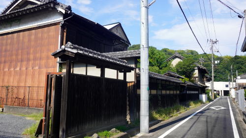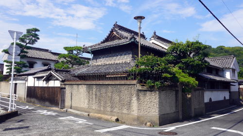 寄島町は県南西部の瀬戸内海沿岸の町である。幹線国道沿いから外れた位置にあり静かな佇まいだが、中心街は海岸に沿って1.5kmも展開しており、その意外な大きさに驚く。 現在町役場等のある中心地より南側は広大な埋立て地となっている。この平地の南端には三郎島があり、若干の集落が見られるが、この一帯こそ、江戸時代関西より北国を目指した西回り航路、北前船と呼ばれた商船の碇泊した所である。鴨方藩の外港として栄えた当地は大いに繁栄を見たが、明治になって山陽鉄道の開通後物資の輸送が陸上に移ってから、貿易港、商港としての町の機能は次第に衰微していった。 町並の西部に大浦神社がある。この神社では毎年秋に競馬神事という奇祭が行われている。この辺りより東端の東安倉という地域にかけては、港町として栄えたであろう時代の名残が町並のあちこちに見受けられる。伝統的な建物が連続した個所こそ少ないものの、つし二階という中二階形式や、二階正面の虫籠窓や張り瓦、妻部にかけてのなまこ壁装飾、本瓦葺等が特色として挙げられ、この地域の古い建物の特色が良く残されている。また、入母屋造りの豪華な外観で、防犯用にくぐり戸付の大戸口を備えた旧家も数軒見られた。 西安倉、東安倉地区は山が海に迫っており、町並は斜面にも展開している。ほとんどが車の入れない細い路地であり、その界隈にも港町の体臭の濃い家並が集中していた。 町内には散策する訪問客も全くなく、観光客相手の案内板もまったくなく完全に素のままの町並である。貴重な古い町並の一つといえよう。 |